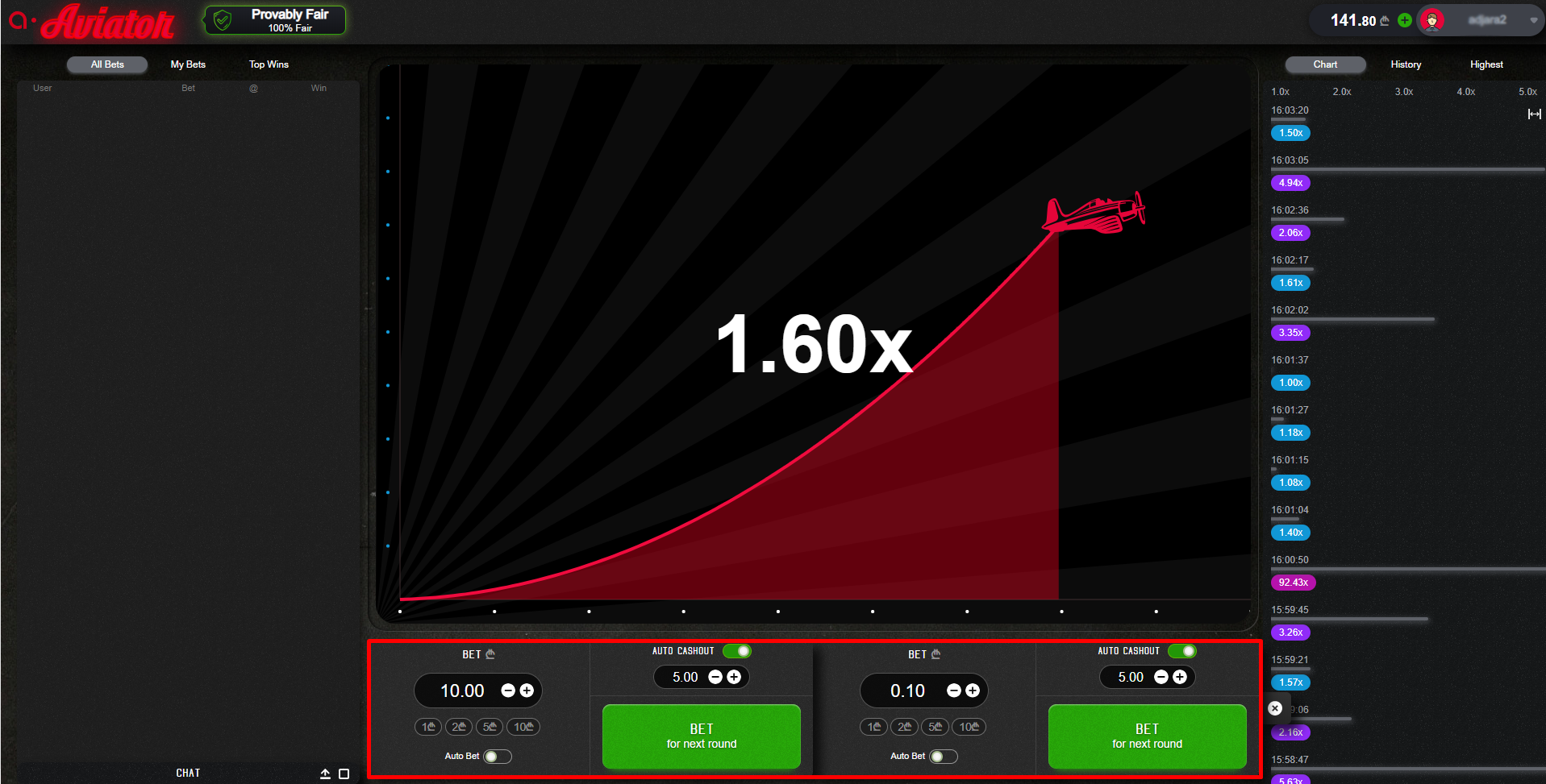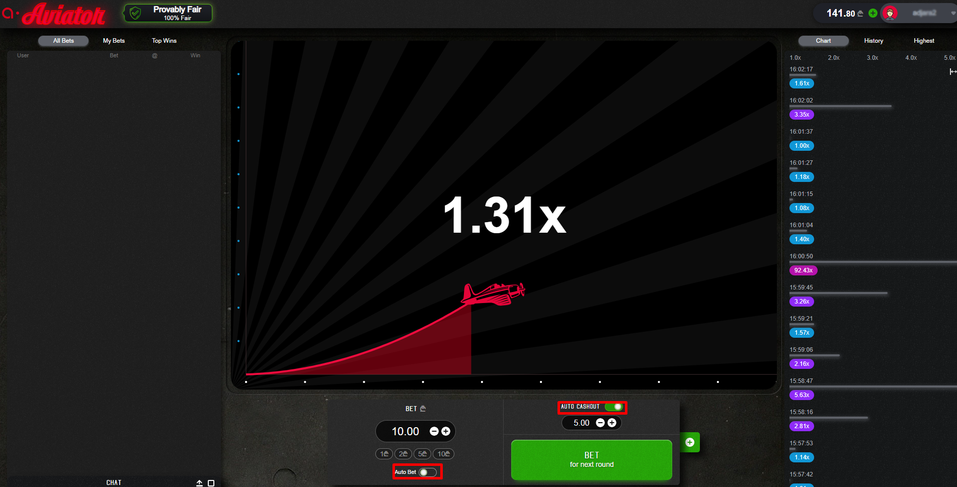Npr. Ukoliko je u opciji Auto Cashout igrač izabrao 2,00X indeks kao granicu za isplatu, dobitak će biti automatski isplaćen ukoliko indeks dostigne 2,01X.