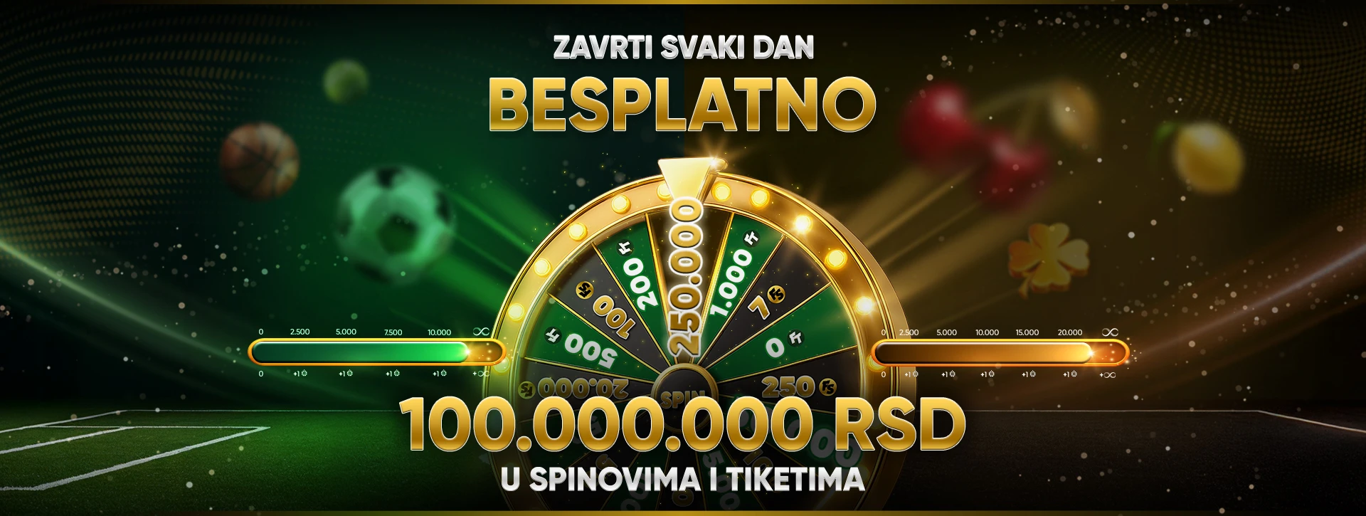 Zavrti točak i Maxbet te časti! Na svaka 24 sata okušaj svoju sreću, zavrti bestplatno točak i možeš da osvojiš do 100 miliona dinara u spinovima ili tiketima! MaxBet uvek ispoštuje – tvoje je samo da zavrtiš!